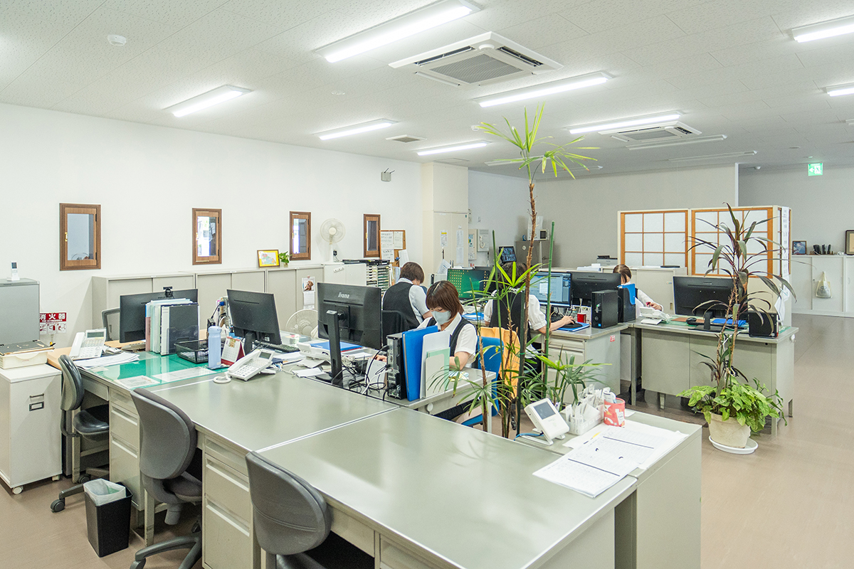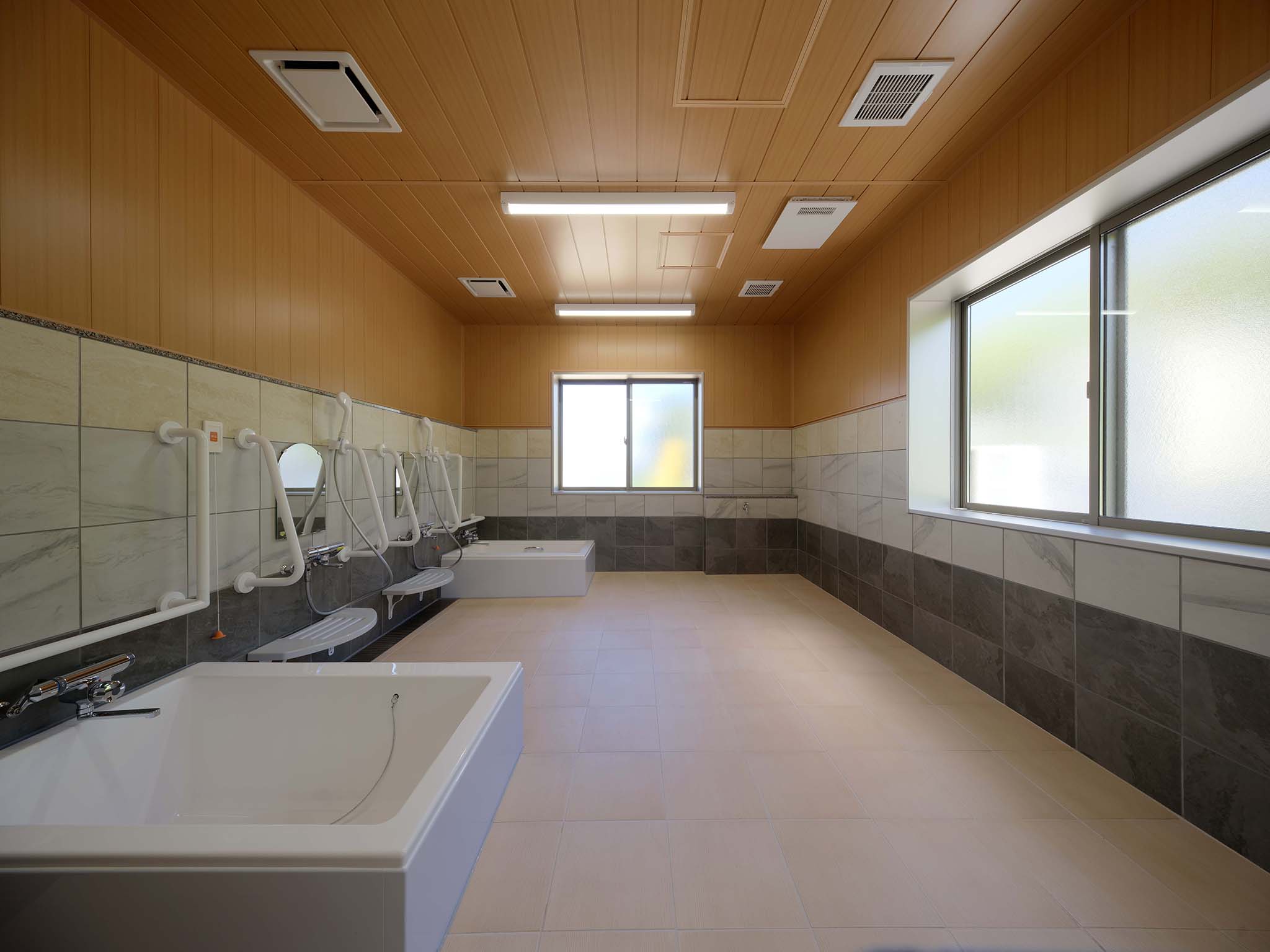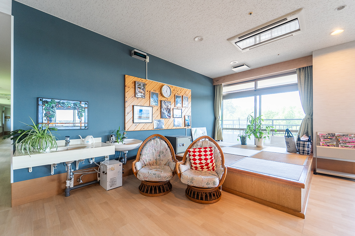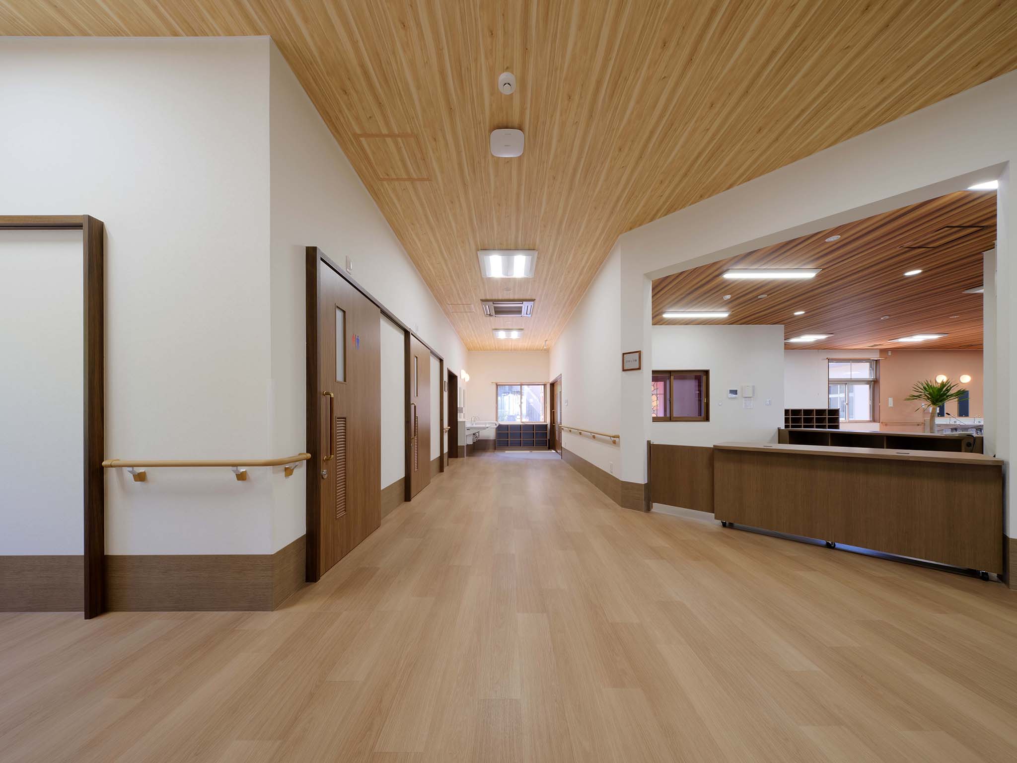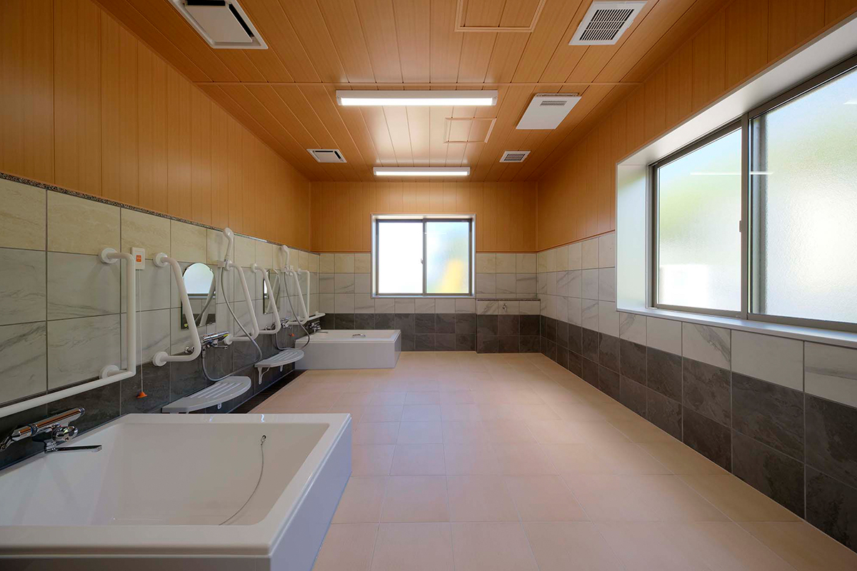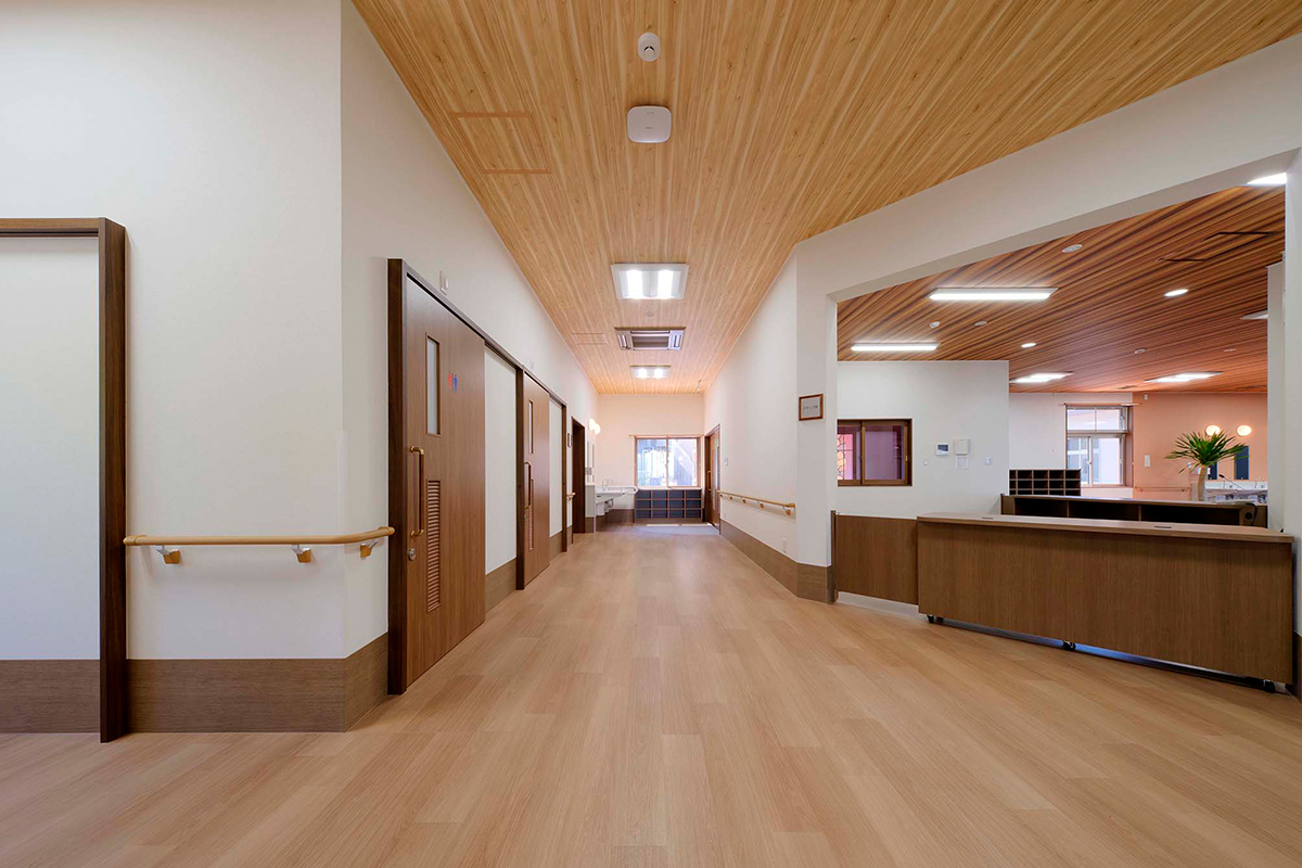 ペアガラスを採用した高い断熱性と、冬は居室まで温かい全館暖房で、年間通して快適に過ごせる環境を整えています。床は弾力性のある安全設計で転倒時の衝撃を軽減します。また、廊下から居室のデイ入り口が見えにくいカーブ構造を採用し、プライバシーにも考慮しました。
