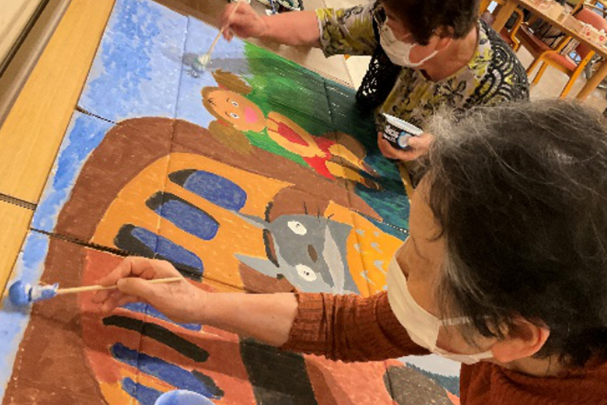 デイサービスセンター明治清流苑では、午後からのレクリエーションのひとつとして「手工芸」を行っています。みなさんの力でひとつの作品を作りあげています。写真は、「ネコバス」に絵の具を塗っていただきました。完成した作品がどこに飾っているか?は、ぜひ見に来てください。お待ちしています。