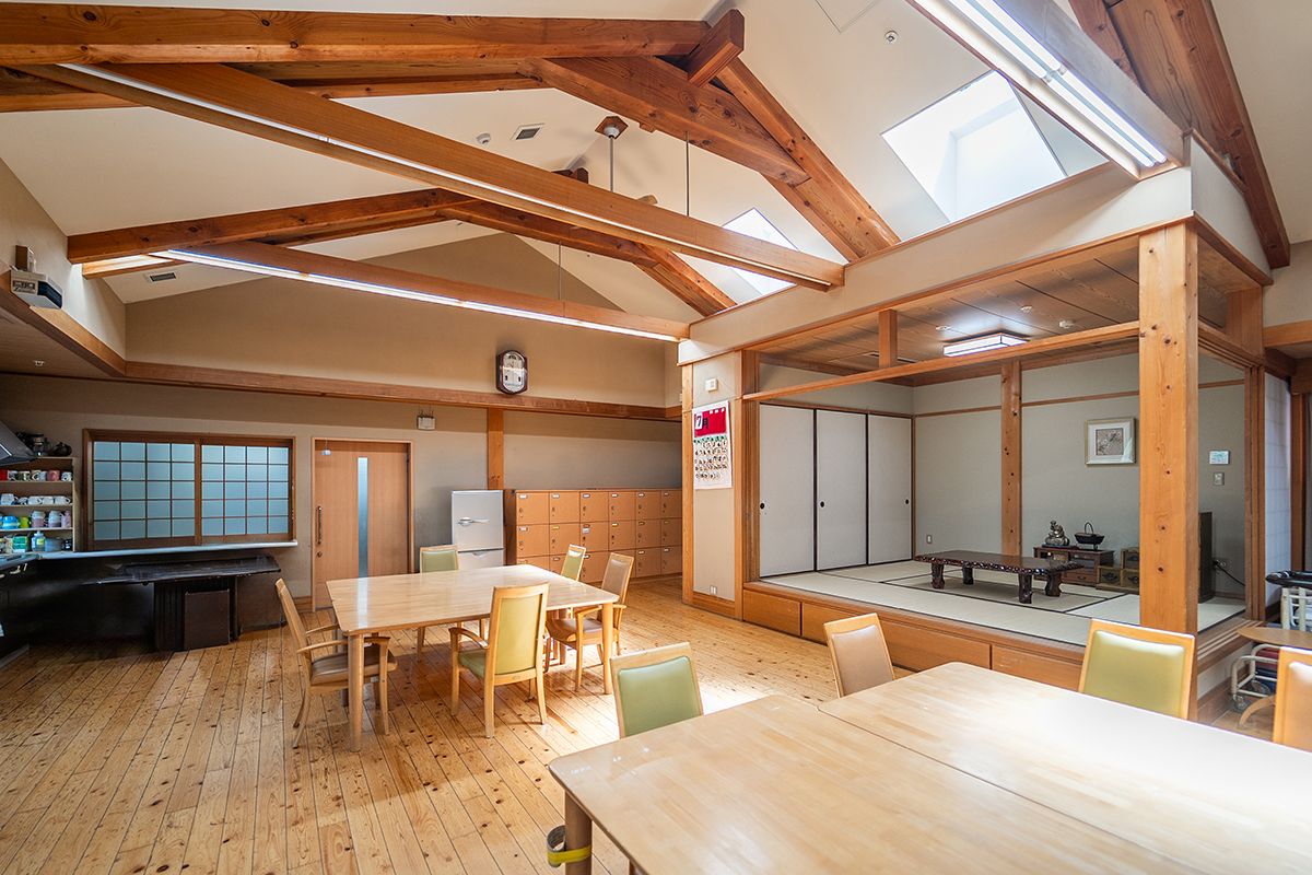 「もう一つの我が家」となるよう、日本従来の木造と畳にこだわった建築設計となっています。「びわのす」は小規模多機能型居宅介護施設とグループホームが併設されており、在宅生活が可能である間は、小規模多機能を利用。