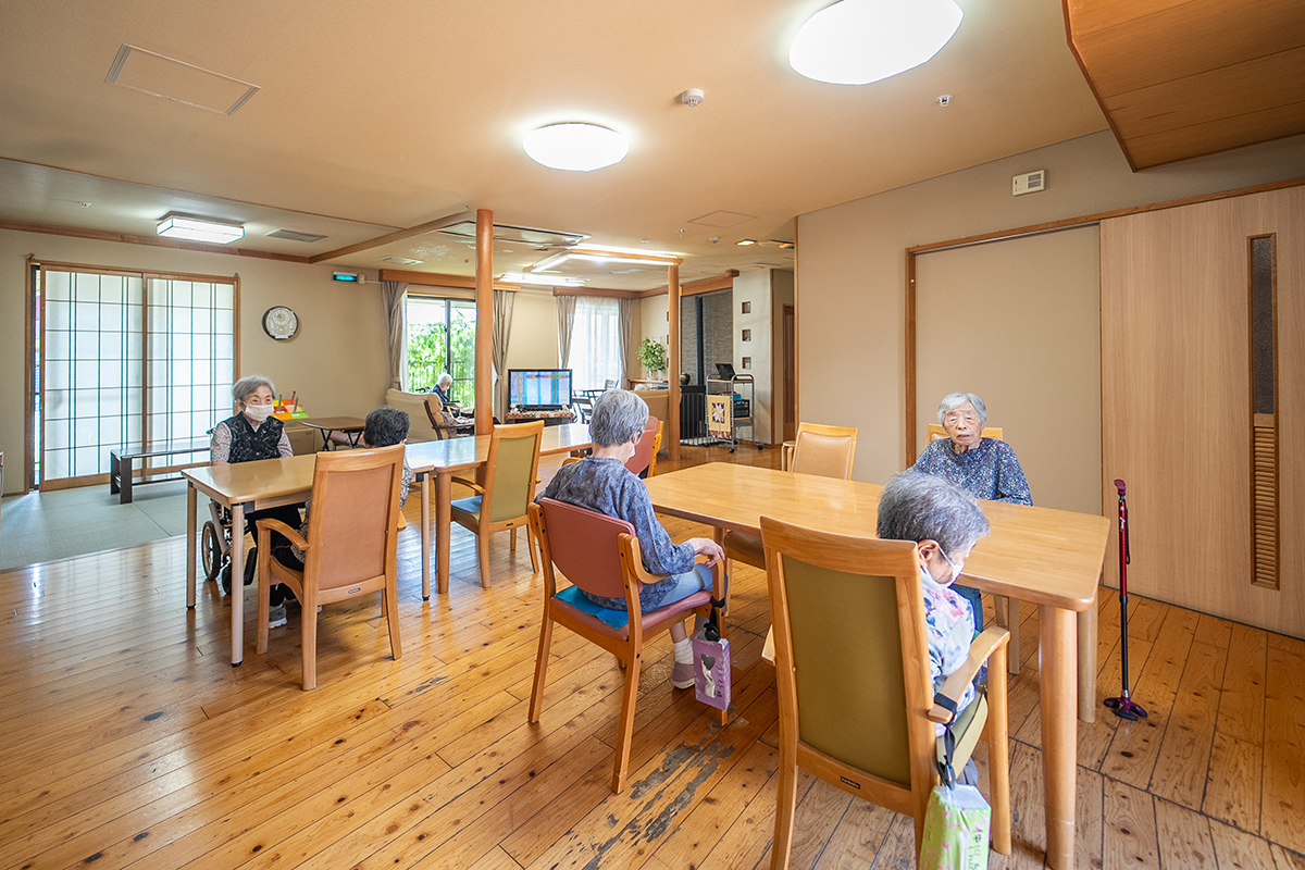 木のぬくもりを感じる明るいリビング。大きな窓から自然豊かな緑の風景がのぞき、キッチンでは料理をする職員の姿が見えます。ソファやテーブルでゆっくり過ごしながら、まるで自宅のように安心できる、あたたかな時間が流れています。
