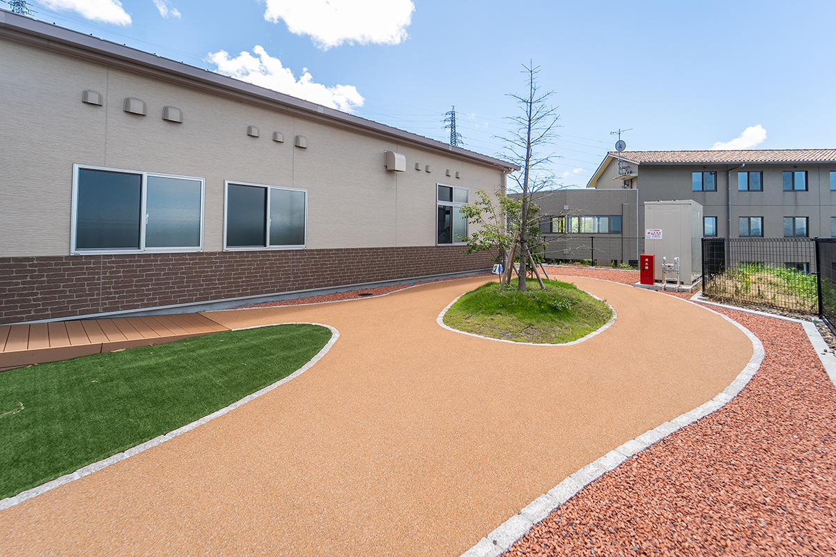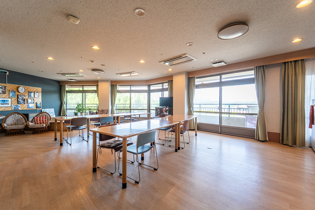 ペアガラスを採用した高い断熱性と、冬は居室まで温かい全館暖房で、年間通して快適に過ごせる環境を整えています。床は弾力性のある安全設計で転倒時の衝撃を軽減します。また、廊下から居室のデイ入り口が見えにくいカーブ構造を採用し、プライバシーにも考慮しました。
