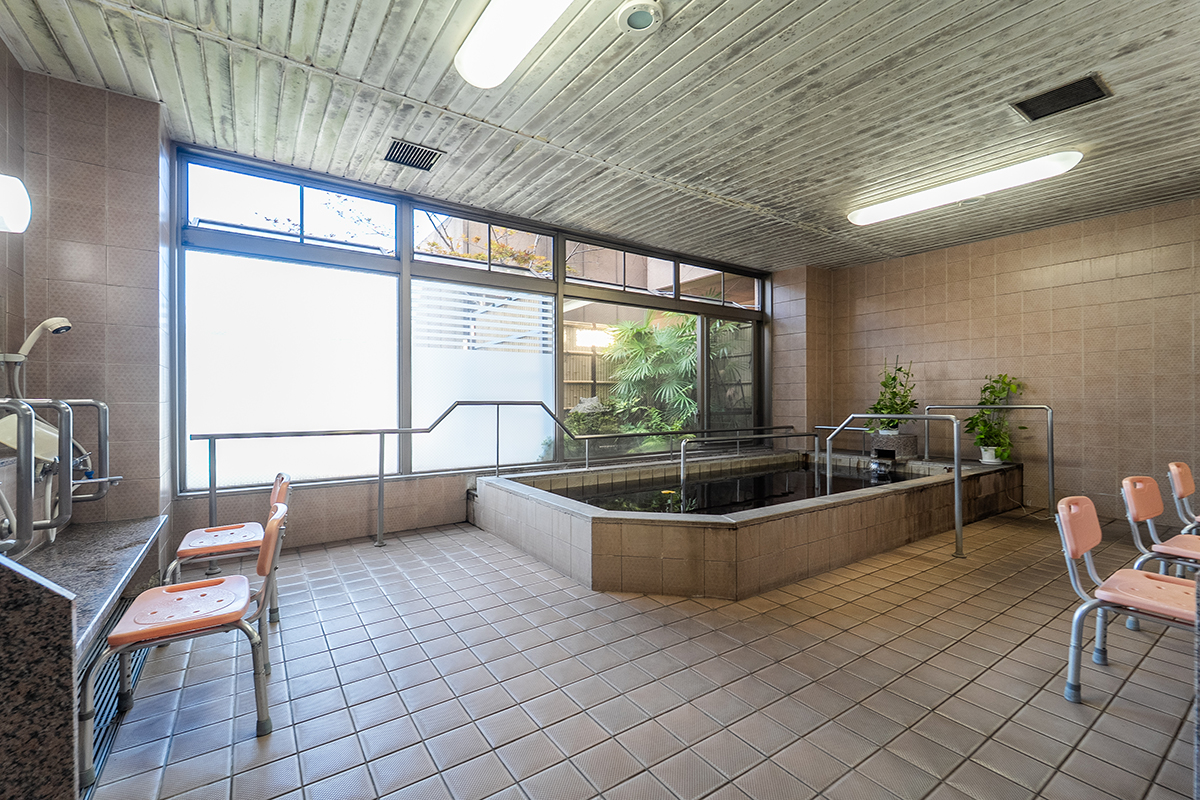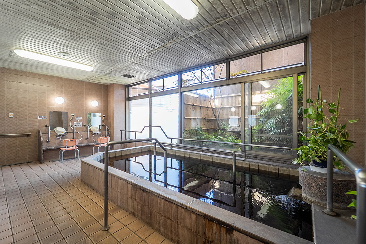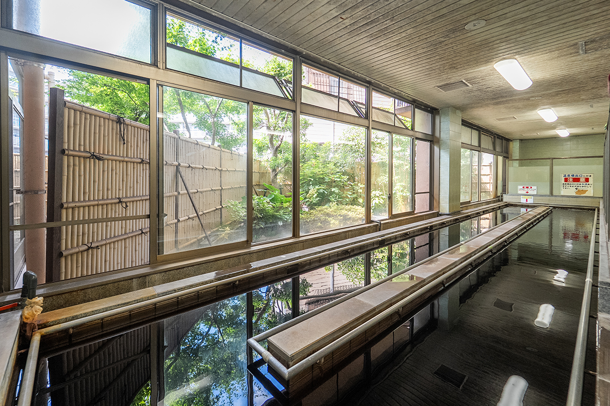 自慢の天然温泉の歩行浴は、1週22メートルの広々としたコース。温泉のあたたかさに包まれながら無理なく下肢の筋力向上や転倒予防に役立つ歩行訓練ができます。関節の負担が少ないため、どなたでも安心して取り組めます。