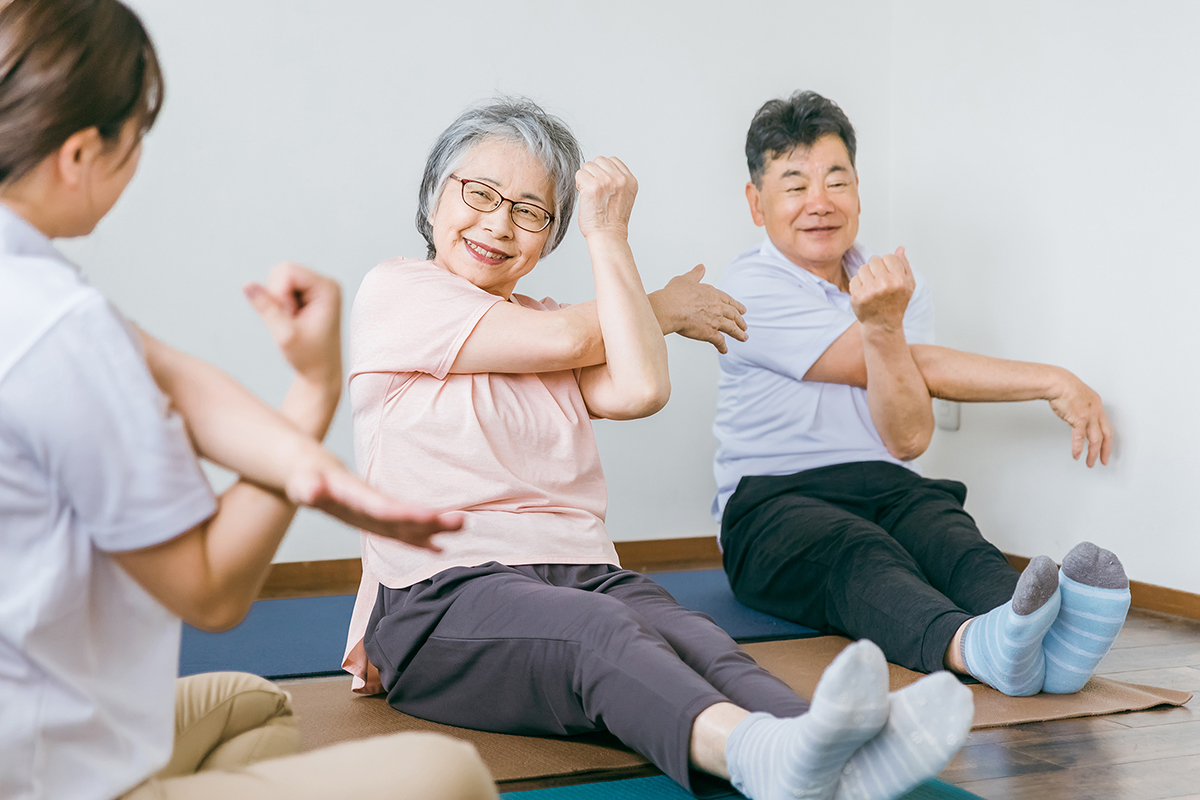 集団体操や生活動作訓練を取り入れ、脳トレセンターでは高齢者の身体機能の維持・向上を目指しています。毎日の運動で、元気でいきいきとした生活を支えます。
