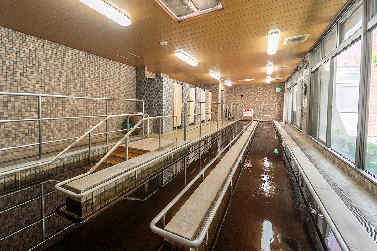 当施設の歩行浴は天然温泉を利用しており、関節や筋肉に負担をかけず安全に運動が行えます。水の浮力が体を支えてくれるため、普段歩くのが難しい方でも、安心して歩行訓練が可能です。