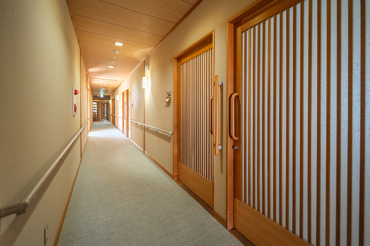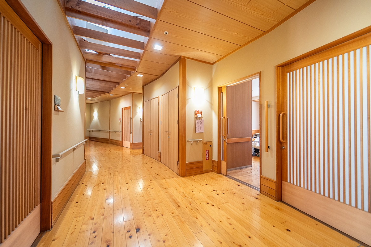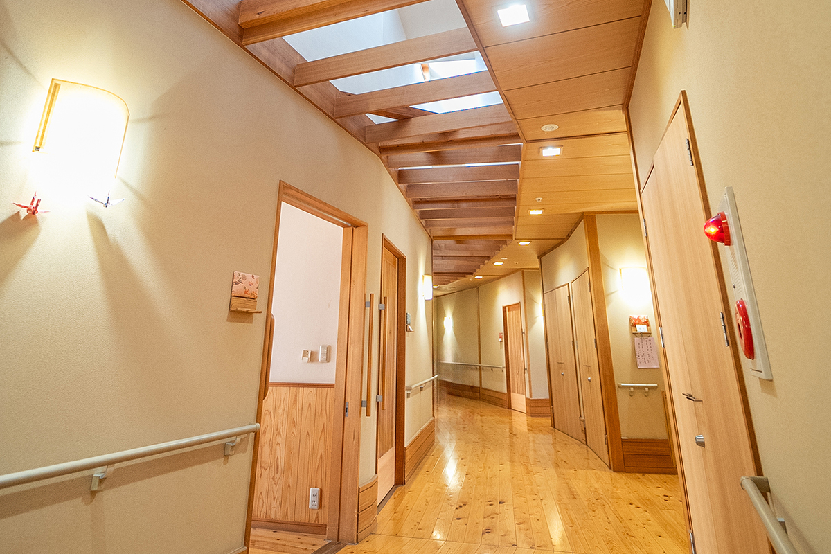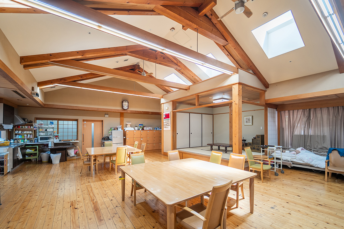 「もう一つの我が家」となるよう、日本従来の木造と畳にこだわった建築設計となっています。「びわのす」は小規模多機能型居宅介護施設とグループホームが併設されており、在宅生活が可能である間は、小規模多機能を利用。