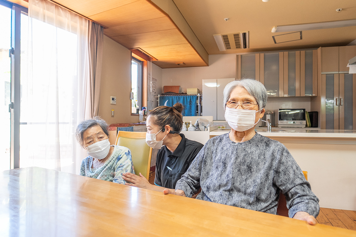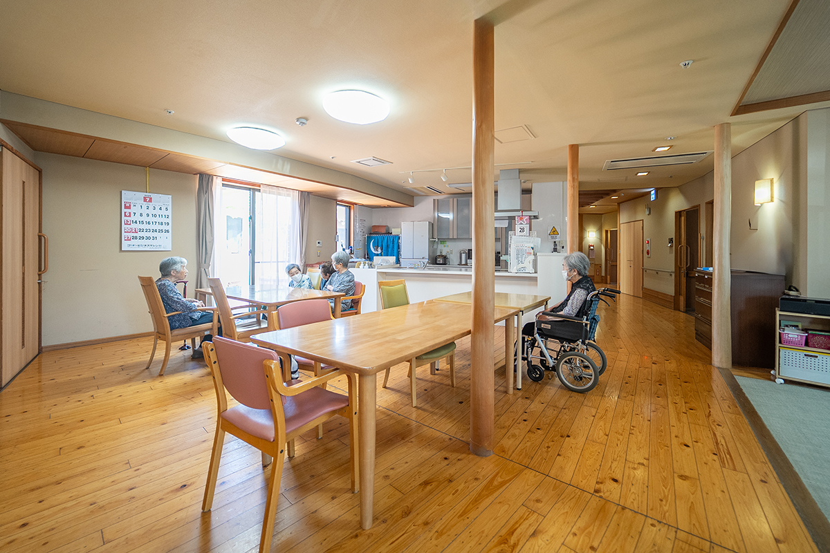 木のぬくもりを感じる明るいリビング。大きな窓から自然豊かな緑の風景がのぞき、キッチンでは料理をする職員の姿が見えます。ソファやテーブルでゆっくり過ごしながら、まるで自宅のように安心できる、あたたかな時間が流れています。